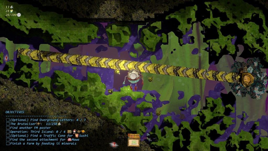 As I said, Mashina does make some tweaks to this hoary, dirt-encrusted formula. Mashina herself, the player character, doesn’t have a fuel or oxygen gauge, which are common limiters in this type of experience. Really, the only things stopping a player from digging down indefinitely are limited inventory space, and the need to go topside for the drill upgrades necessary to bite through more ornery materials.